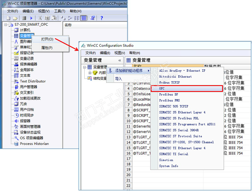 2、添加新的驱动,打开 WinCC 软件新建一个项目,用鼠标右键点击“变量管理”,快捷菜单中选择“打开”。在打开的“WinCC Configuration Studio ”窗口中,鼠标右键“变量管理”,在快捷菜单中选择“添加新的驱动程序”,添加“OPC”驱动。如图下图所示。