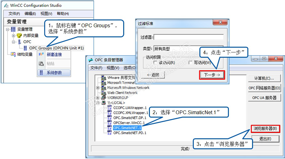 3. 在 WinCC 中搜索及添加 OPC Scout 中定义的变量。首先用鼠标右键“OPC Groups” ,在快捷菜单中点击“系统参数”。在弹出“OPC 条目管理器”窗口中,选择“OPC.SimaticNET.1”,然后点击“浏览服务器”按钮。在弹出的“过滤标准”窗口中选择“下一步” 进行搜索。如下图所示。