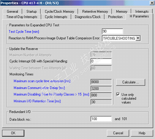 S7-400H的参数以黑色、蓝色进行区分,蓝色参数支持H-CIR功能,即可以在CPU运行时下载。对于中央处理器单元只需对CPU0(机架0上的CPU)设定CPU参数,所设定的数值将自动分配给CPU1(机架1 上的CPU)。除以下参数外CPU1的设置不能更改: