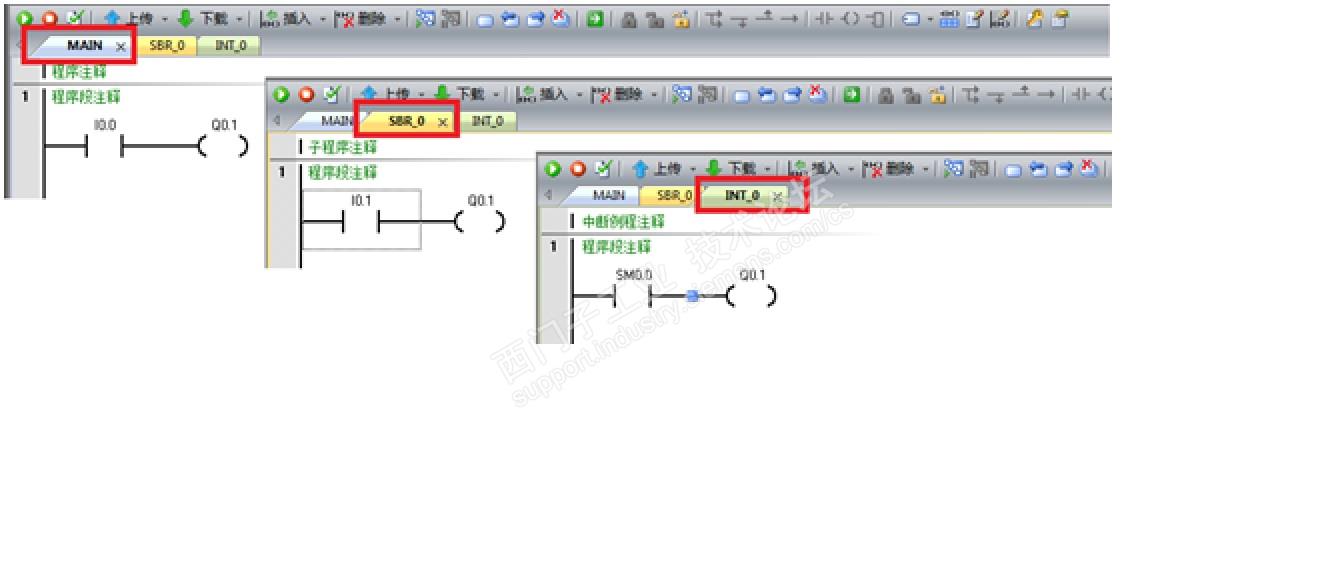 首先编辑一个非常简单的程序,在OB1、子程序、中断子程序中编辑程序,图示: