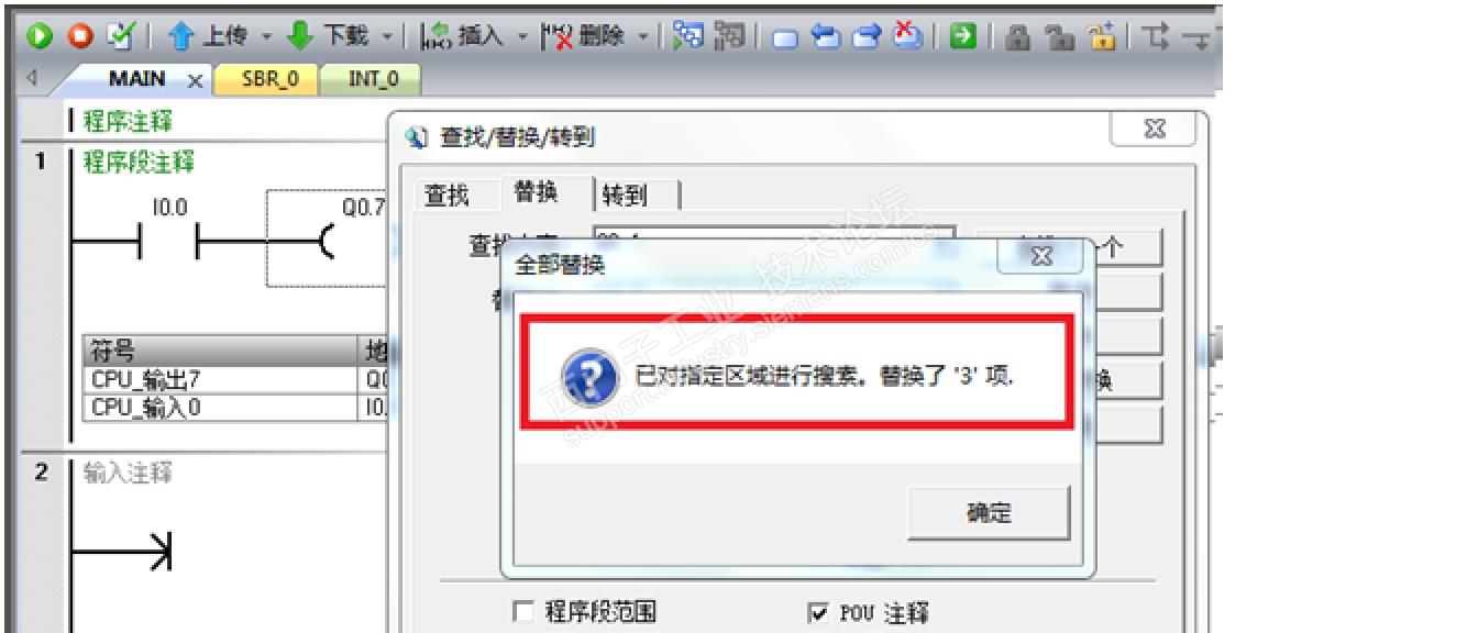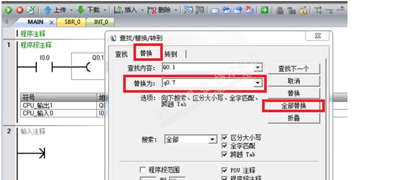 随便打开一个程序段,找到Q0.1(坏点输出)后,按ctrl+F键,在弹出的窗口选择“替换”按钮,在“替换为”选项中输入新输出地址,如修改为Q0.7,选择“全部替换”后,编译下载到plc中就可以了,也是一种非常方便的方法之一,图示: