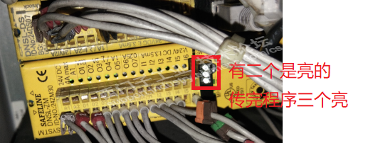 1月23日我赶到公司,根据HMI的报警信息把维修人员的路又重新走了一遍,最后也走到DINA的安全PLC上来了,我看了一下PLC输入信号IN2,3,4都有的,电源指示也正常,但是有三个灯不亮我产生了疑虑,但我还是认为PLC不太可能会坏。