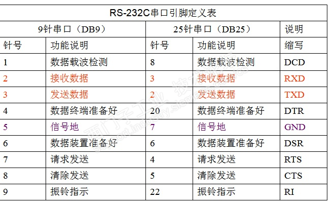 RS232C并未定义连接器的物理特性,不同类型的连接器引脚定义也各不相同,其中9针和25针的引脚定义对照,如下图所示。
