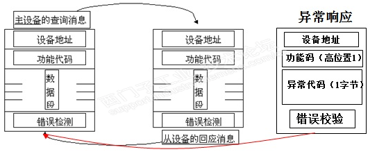 MODBUS RTU 通信协议是以主从的方式进行数据传输的,主动方发送请求,被动方响应请求,应答的方式。在传输的过程中主站是主动方,即主站发送数据请求报文到从站;从站是被动方,即如果正常从站返回正常响应报文,如果故障从站返回异常响应报文,如下图所示。