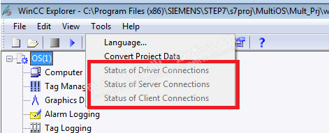 2、 打开服务器的WINCC,选择tool菜单中Status of serverconnections检查连接状态