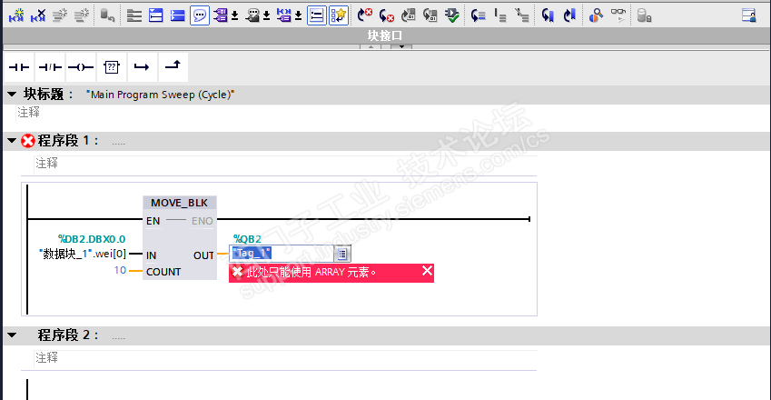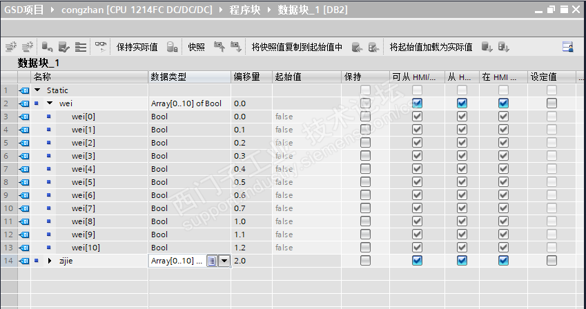 我想把位数组传送给字节,如图,想把数组传送给另一台CPU,用GSD镜像两个CPU实现数据传输,现在数组怎样把数据全部传送给QB2,QB3.请大佬指点一下。