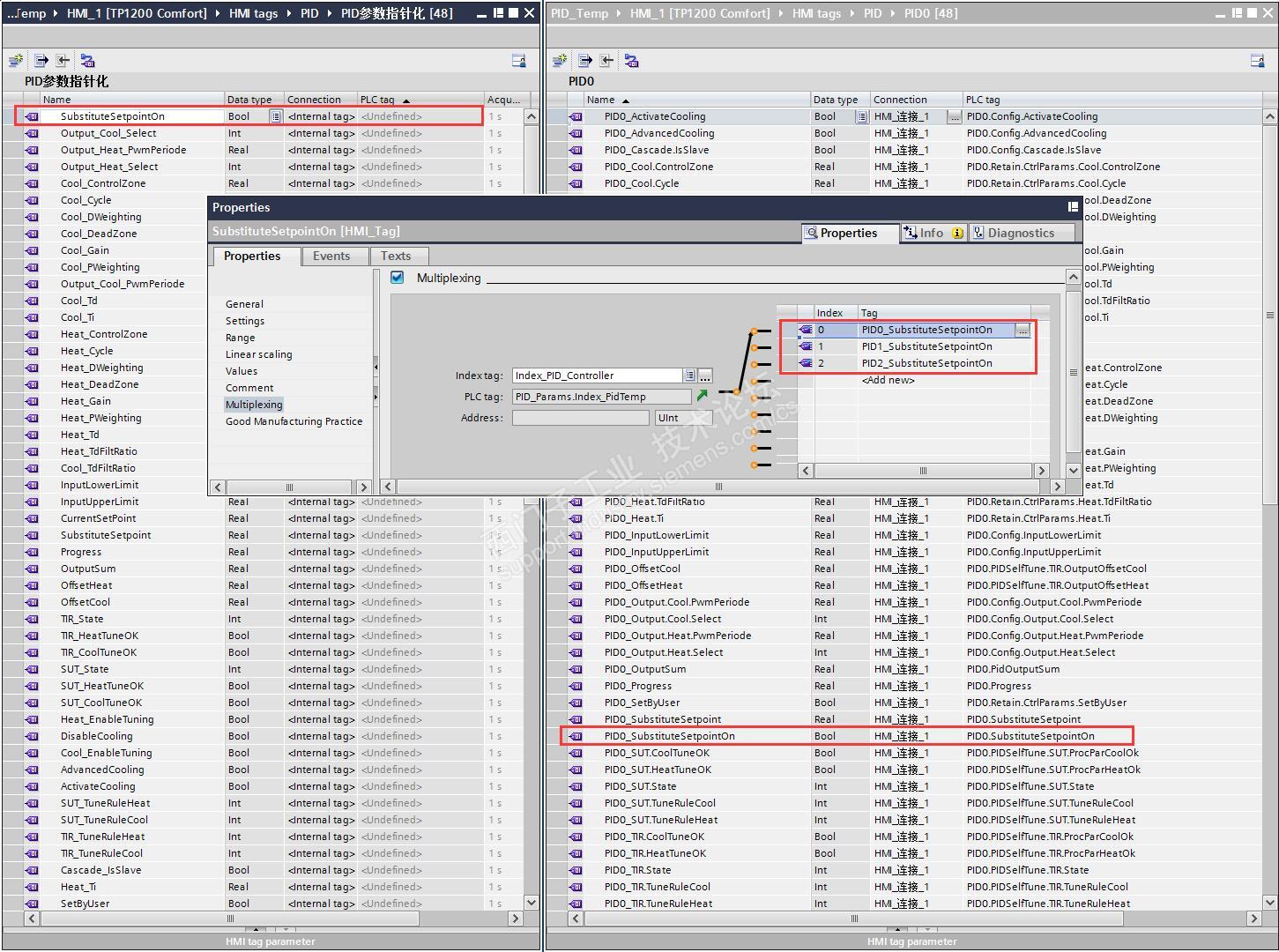 这种情况下,如果要在HMI上自建调试面板,以取代博途的工艺对象面板,便于现场操作人员调试。HMI变量可以用指针化对多个PID的静态变量间接寻址。