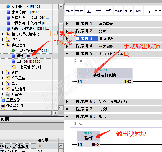 PLC中建立了一个手动DB块,属性:非优化。DB块内部全部是手动操作执行器的BOOL量。