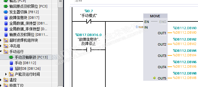 在程序MAIN第五段,手动块中对手动块数据操作:如果非手动或故障中,将0 MOVE 到手动块字中。