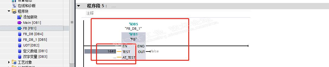 1、为什么答案调用FB块以后出来的引脚跟我的不一样,TEST与AT_TEST什么区别