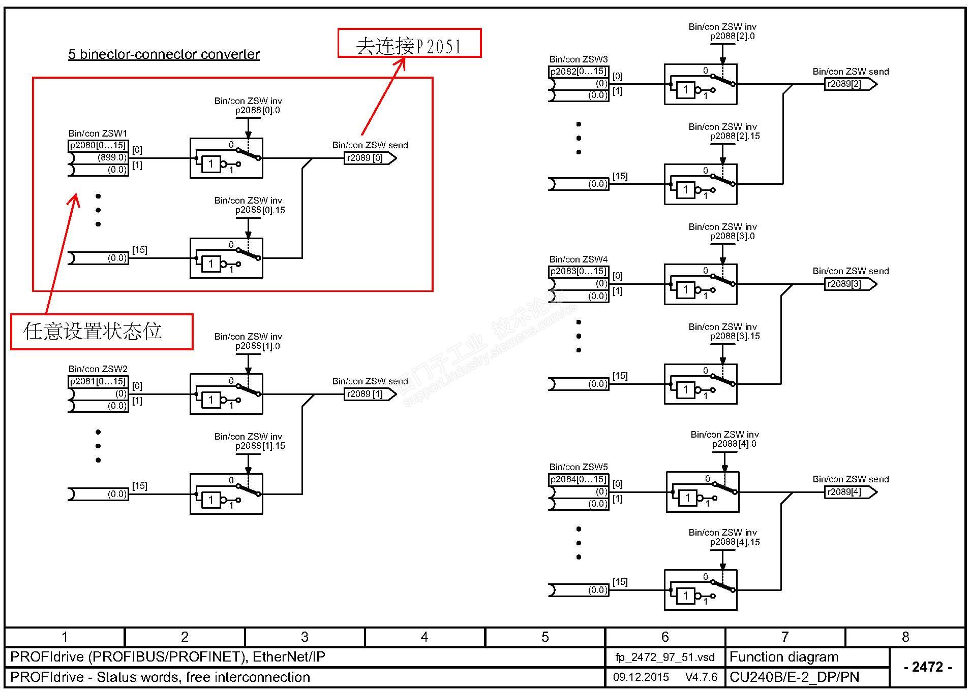 如果不想给整个一个控制字,就想要几个关心的状态,那就把P2051链接一个任意设置的字转换参数。