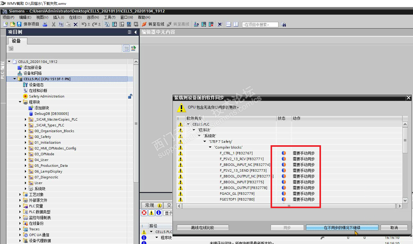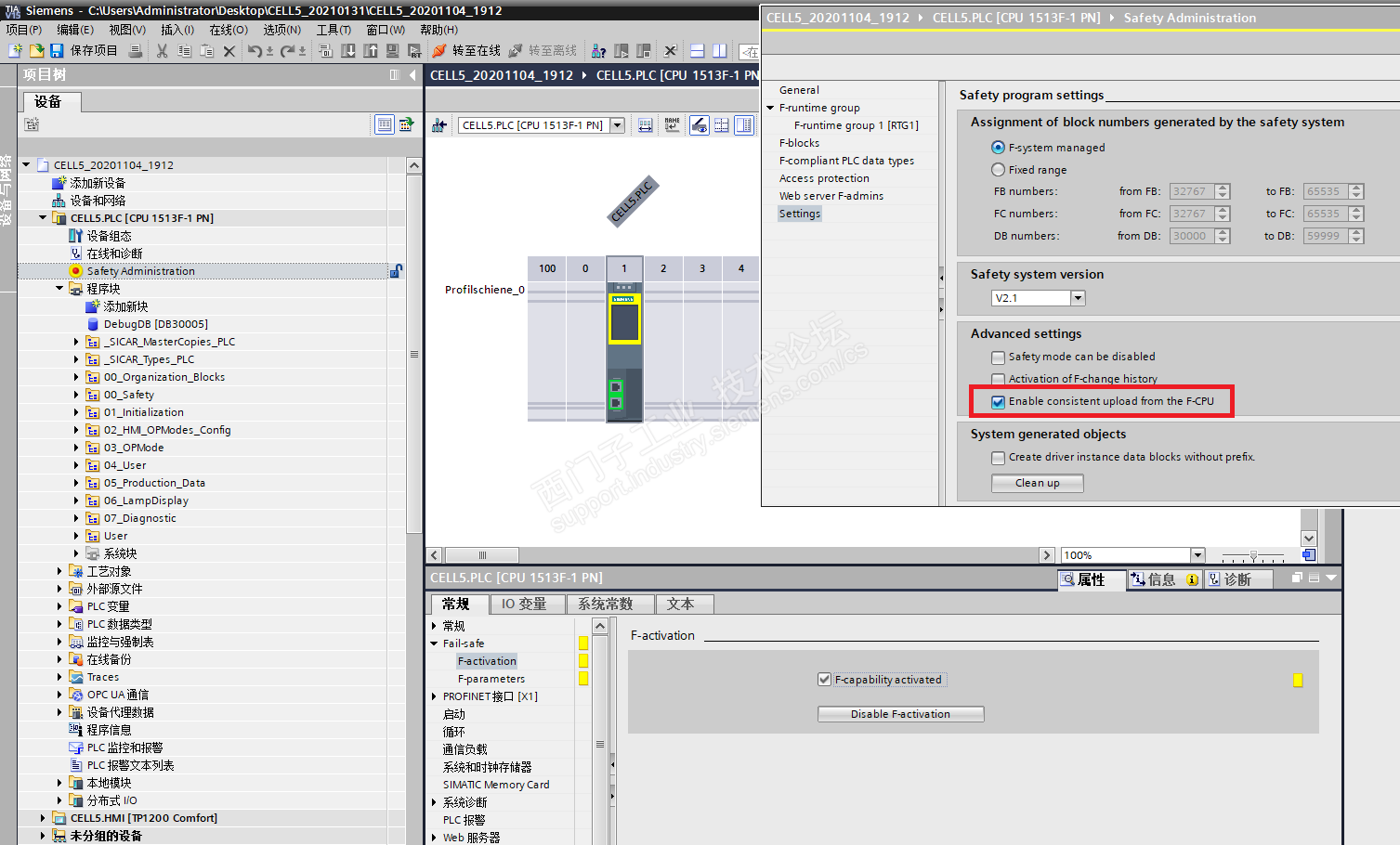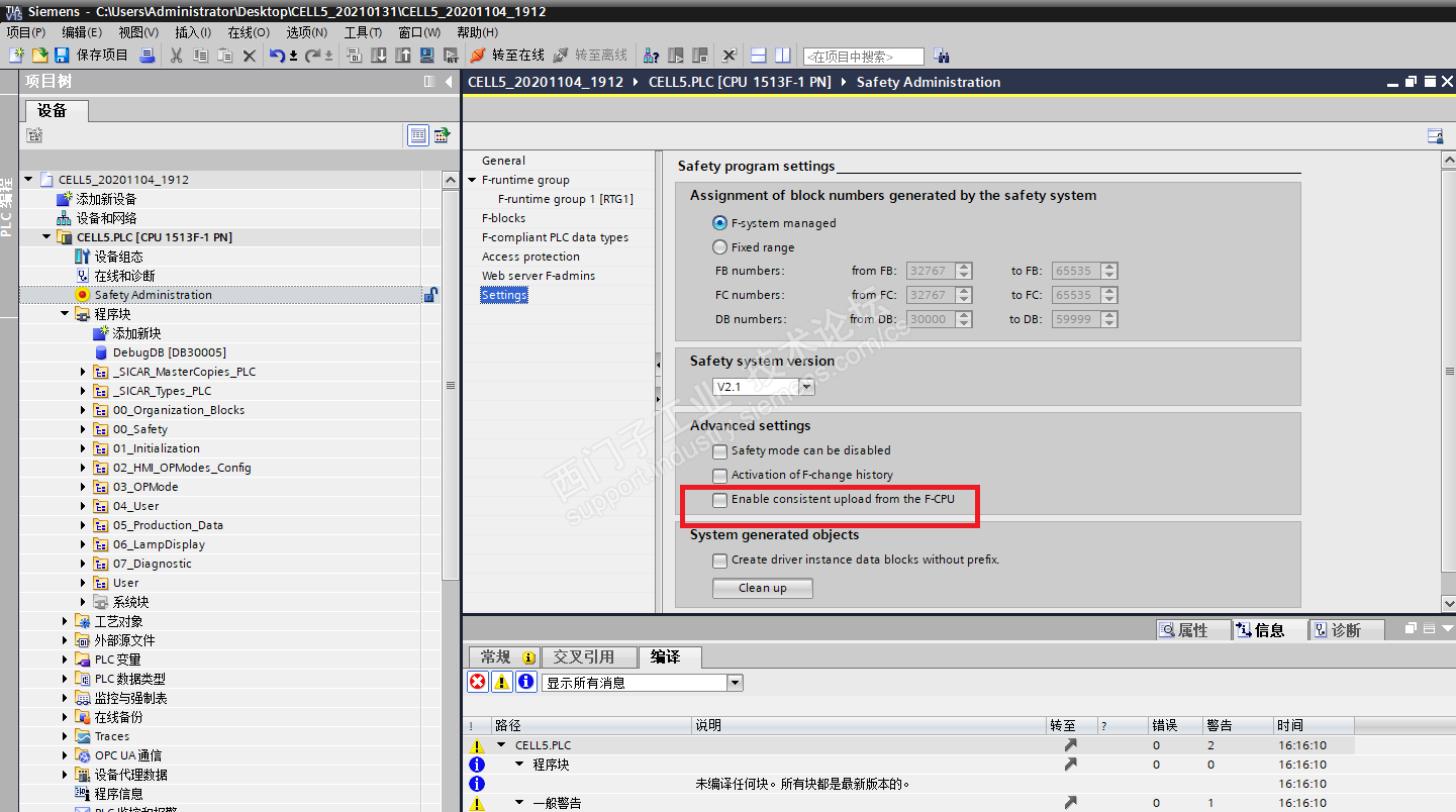 图片1:S7-1515CPU里面已经装载好的F-CPU一致性上传载没有勾选。
