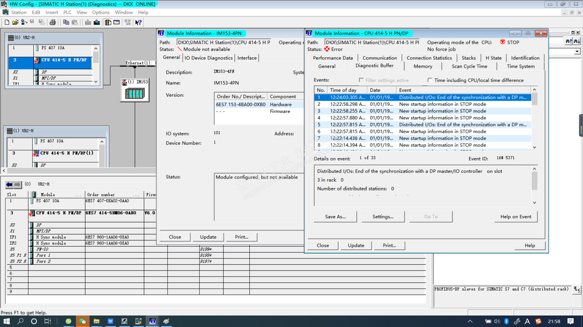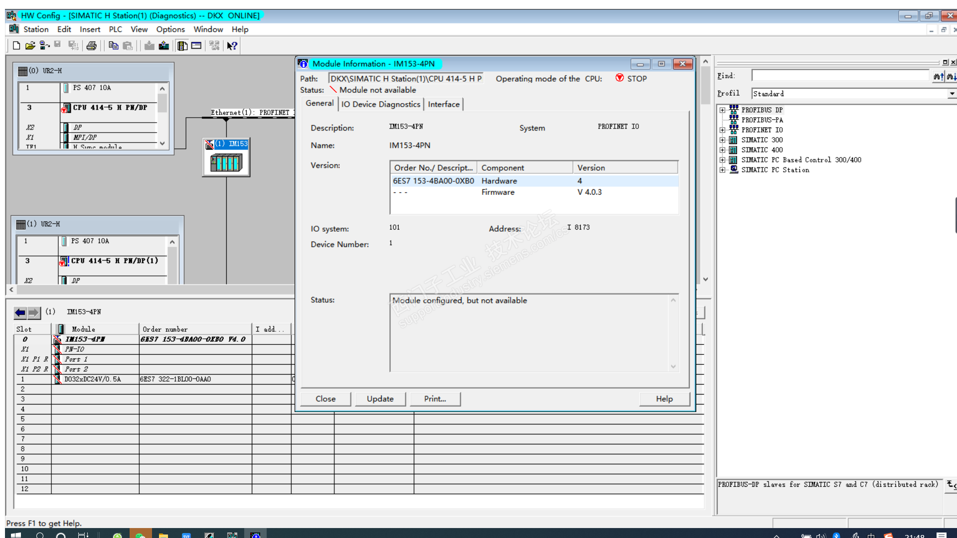 cpu414-5h PN cpu. 不带子站的时候两个CPU工作正常,连接一个153-4 两个CPU都无 法运行,诊断提示IM153-4已经组态,未激活。CPU的冗余指示灯、EXIT指示灯、BUSF指示灯红闪。IM153-4也是红灯闪烁。im153-4 IP直径分配好了,也能ping通,就是连不上。不知道为什么。