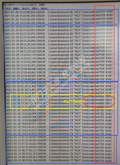 甲是今年新建系统。现场4套cpu315+cp343-1(假设为A,B,C,D),其中A,B,D各通过cp343-1直连一台smart st30,进行put/get通信。然后ABCD连接到交换机X,D与X用光纤收发器连接。其中,A与CD也有put/get通信,均是在A侧编程。然后X通过网线连接到交换机Y,Y连接两台上位机wincc v7.51(每台上位机用两个显示器)。现在每台电脑每隔几个小时,就会瞬间中断,错误代码410E。起初CPU属性中的通信连接资源没有更改,都是默认值。我认为我的连接没有超过16个,就没有改。前几天趁着停机的空闲,重新下载了硬件组态,把CPU的OP连接数量改成了3,同时把通讯扫描占比也改为了30%。运行了1天,WINCC还是出现中断现象,没有改变。PLC与PLC之间的通信是完全正常的。