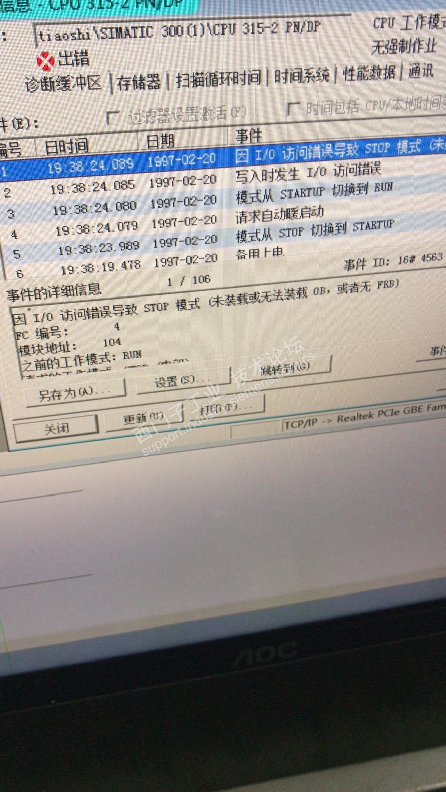 我们300系统,315 2DP,其中 的 AO卡坏了,断电换了张新的AO卡,上电就停机。我知道需要下载 OB122 就行了。但是想查出根本原因是出在哪。是图上的报警信息是说 Fc4块中。模块地址104 的错误? 这个模块地址104是啥意思。 FC4中也没看到有104这个地址。卡件 IO地址也没104这个地址啊