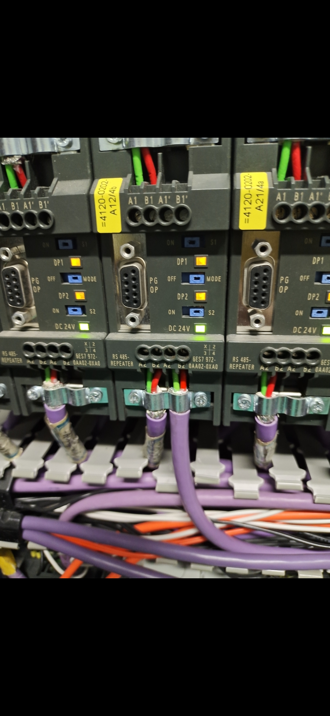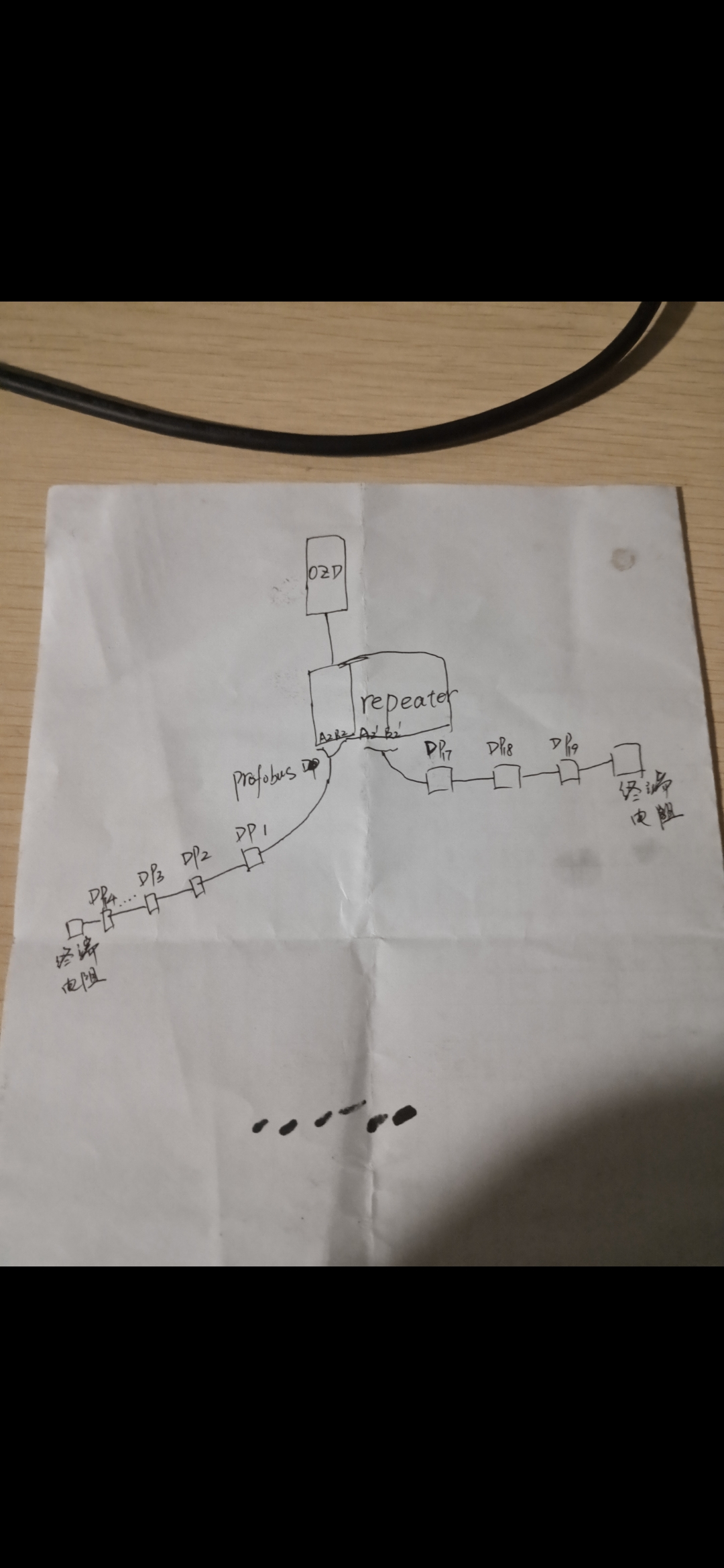 各位大神好,请教各位一个profibus通讯问题:有段网络:"OZD"下接Repeater,然后Repeater下端两组端子各引出一根bus线;一根带有10个Dp地址(bus线大约50米),另一根带3个Dp地址(DP17、DP18、DP19,bus线约15米),每根线都带有终端(如草图);现在的问题是Dp17频繁掉线,Dp18、Dp19正常;如果拔开DP17的DP头后,就会造成Dp18频繁掉线……目前采取的措施是更换过bus线,检查过屏蔽,终端电阻电压稳定,都还是没能解决问题,波特率500K,bus线都套有波纹管……