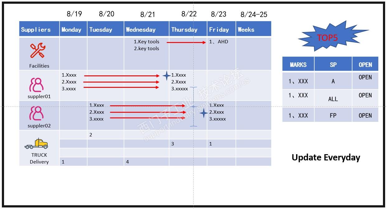 项目管理中涉及内容为供应商、重要的工具、运输事宜及需要进行协调的OPEN项。重点事项需要采用特殊符合进行标识,这样便于重点关注。可以使用连线的形式让彼此相关的事项进行关联,显示进度情况。