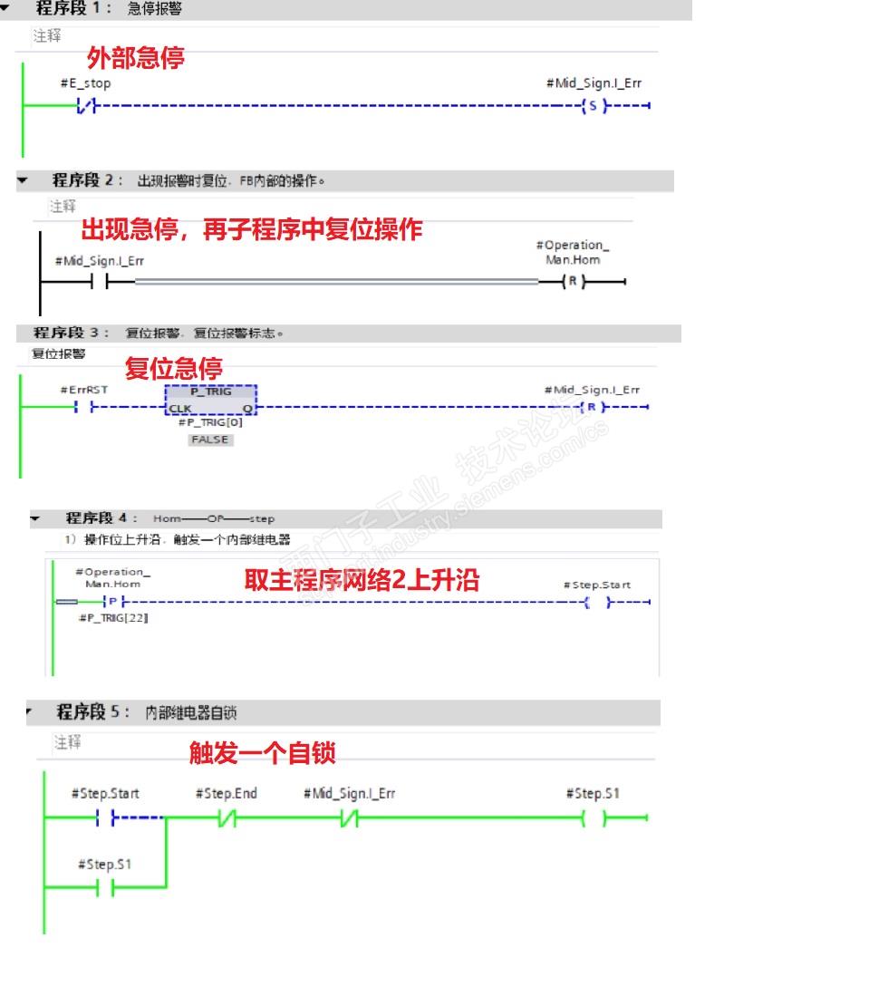 1)调用一个FB子程序,子程序FB1002输入引脚:一个急停输入,一个故障复位。