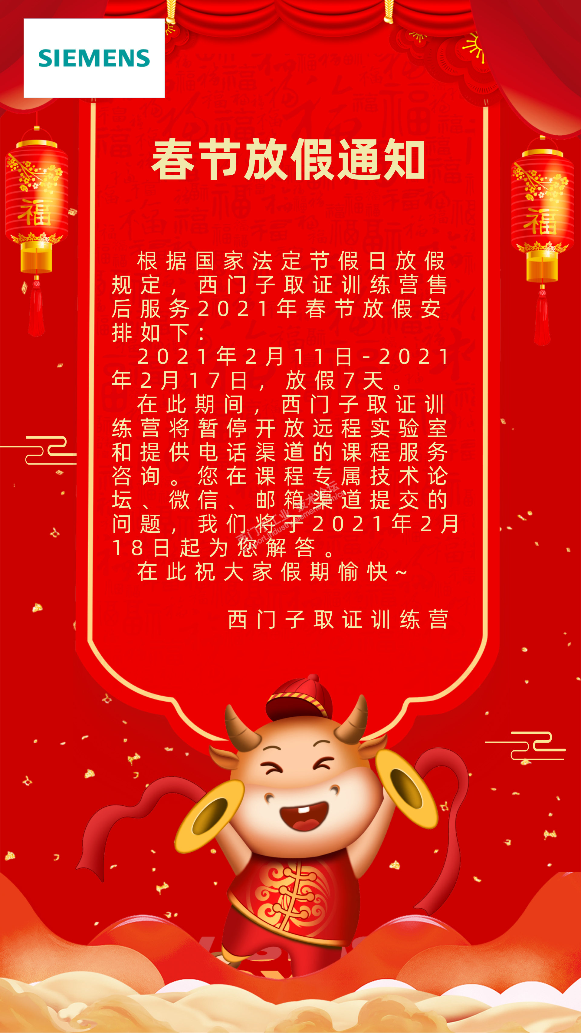 西门子取证训练营售后服务将于2021年2月11日-2021年2月17日放假7天,期待春节后与您邂逅~