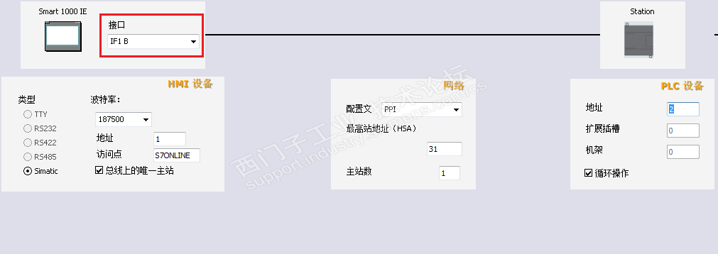 5、设置连接参数。首先选择Smart 1000 IE的接口为“IF1 B”,即触摸屏的RS422/485物理接口。选中该接口后,该接口的参数设置窗口将在其下方自动显示。设置触摸屏的通信波特率为187500,站地址为1。