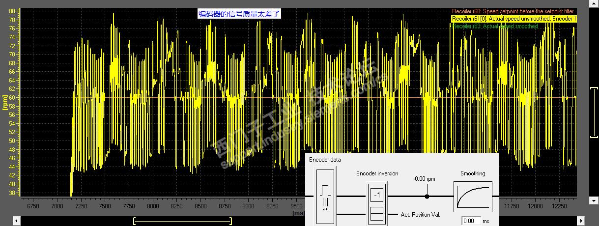 不同的信号,对应编码器模版的设置要不同,以适应硬件的特性。其实就是编码器输出的阻抗匹配。(这些是电气检查,我一般是直接用示波表观察信号质量。)稳速运行时,示波表上信号宽度是不会抖动的。