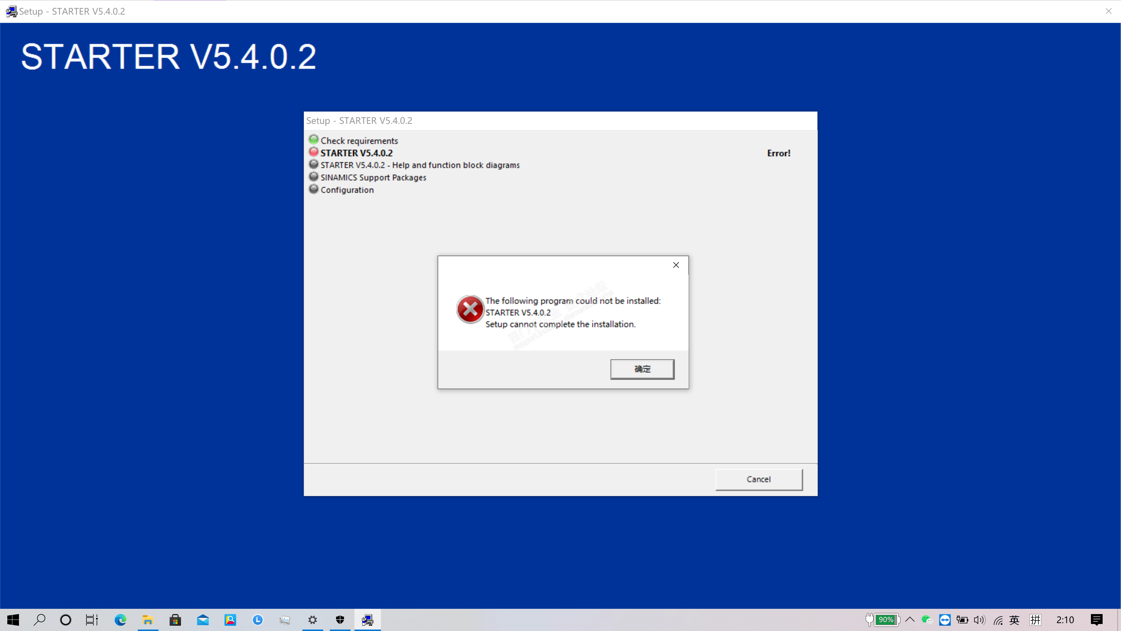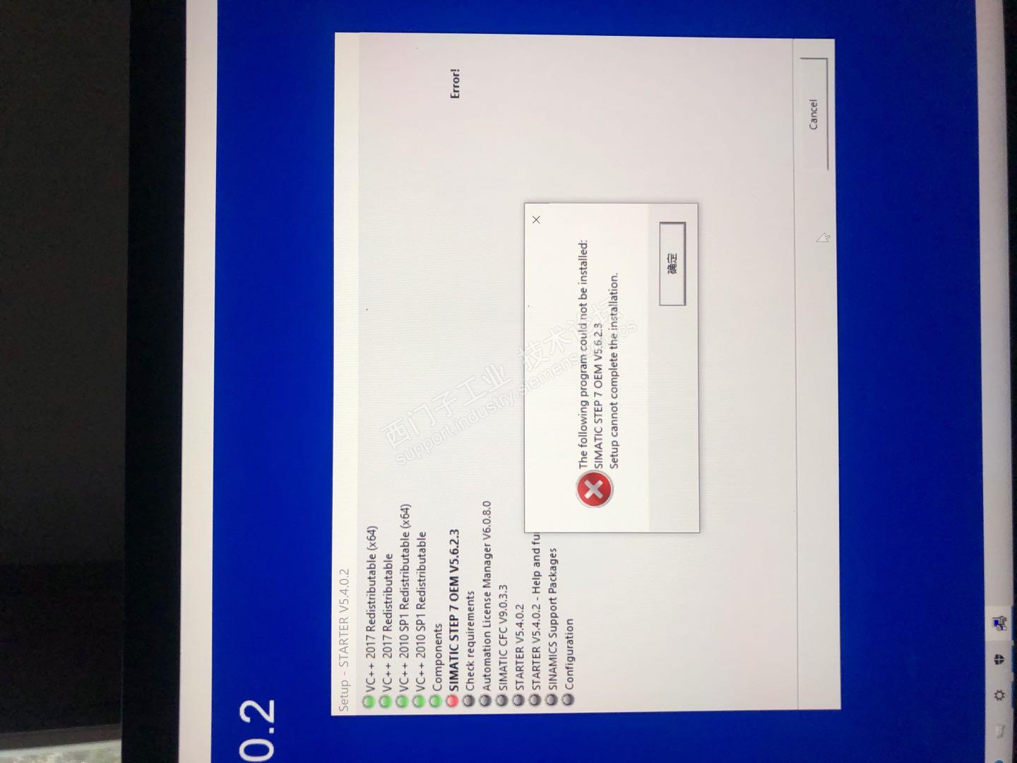 win10专业版20H2,内部版本号19042.804,西门子网站下载STARTER V5.4.0.2安装多次总是失败,开始出现重复启动系统警报,百度搜索删除注册文件PendingFileRemameOpeaations后可以继续安装,后又出现需要安装step7 v5.6,下载安装并授权后继续安装到statrer v5.4的时候又出现安装失败警报,求助高手指点,不胜感谢!