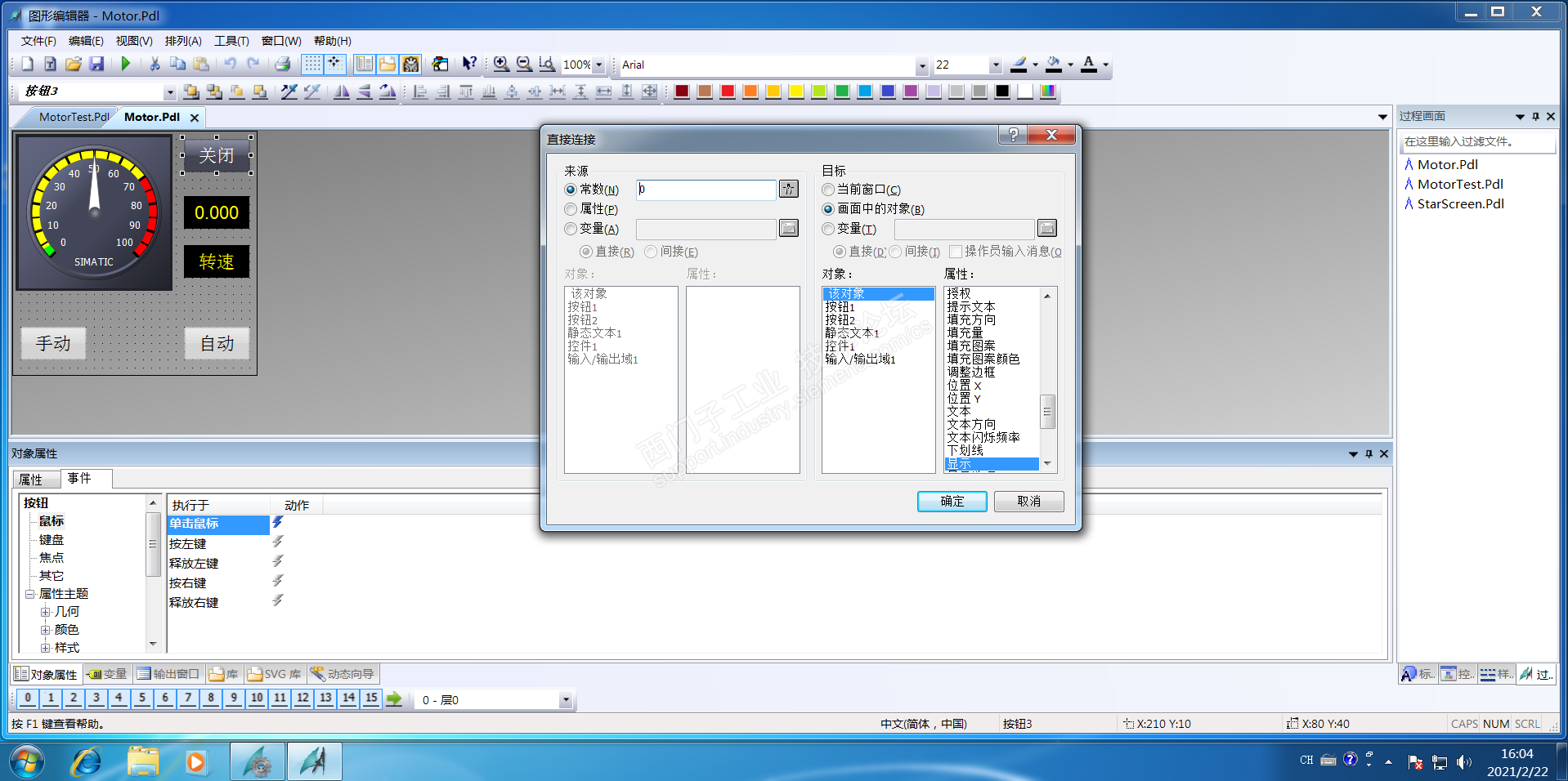 请详细描述一下关闭按钮的组态,例如是使用的脚本或者是直接连接,如果可能请提供组态截图。