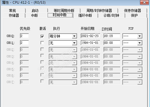 请教下各位朋友,我想实现STEP7中采集的模拟量A减去1分钟前A的值并保存到B中,若B大于2则报警。这个操作该如何实现。目前我了解到的是通过时间中断,已经在STEP7硬件组态的CPU属性中进行了设置,如附件图所示,并且在BLOCK中创建了OB10,现在有两个问题不太明白:一个是图中时间中断的开始时间日期应该怎么写,比如我25号测试,那么开始日期写到20号是不是就行? 第二个问题是OB10中应该怎么编程实现(模拟量A减去1分钟前A的值并保存到B中,若B大于2则报警。)