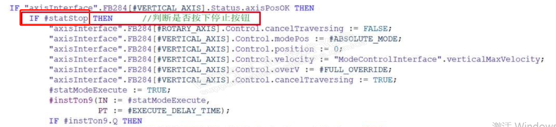 问2:课程中讲解到上图圈出的systemStop 是由常规控制里面对轴的一些报警的判断那里给出的。这里的ModeControlInterface.systemStop 是不是关联的常规控制FB块的faultLED管脚?