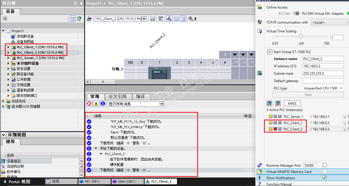 问题如下图,将PLC_Client_1下载到虚拟PLC中无报错。之后下载PLC_Client_2的组态和程序时对话框“下载到设备”没弹出,编译无报错 。PLC_Client_2虚拟CPU报错,请问这是为什么?