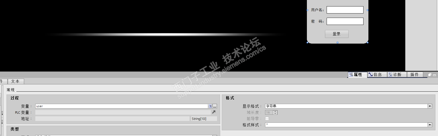 打开输入输出域属性,分别将变量关联至前面设置好的内部变量“user”和“password”,显示格式设置为字符串