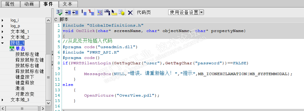 打开按钮的事件,插入脚本,并且将GetTagChar()括号内填写之前设置的内部变量名,在OpenPicture()括号内填写成功登录后的界面。