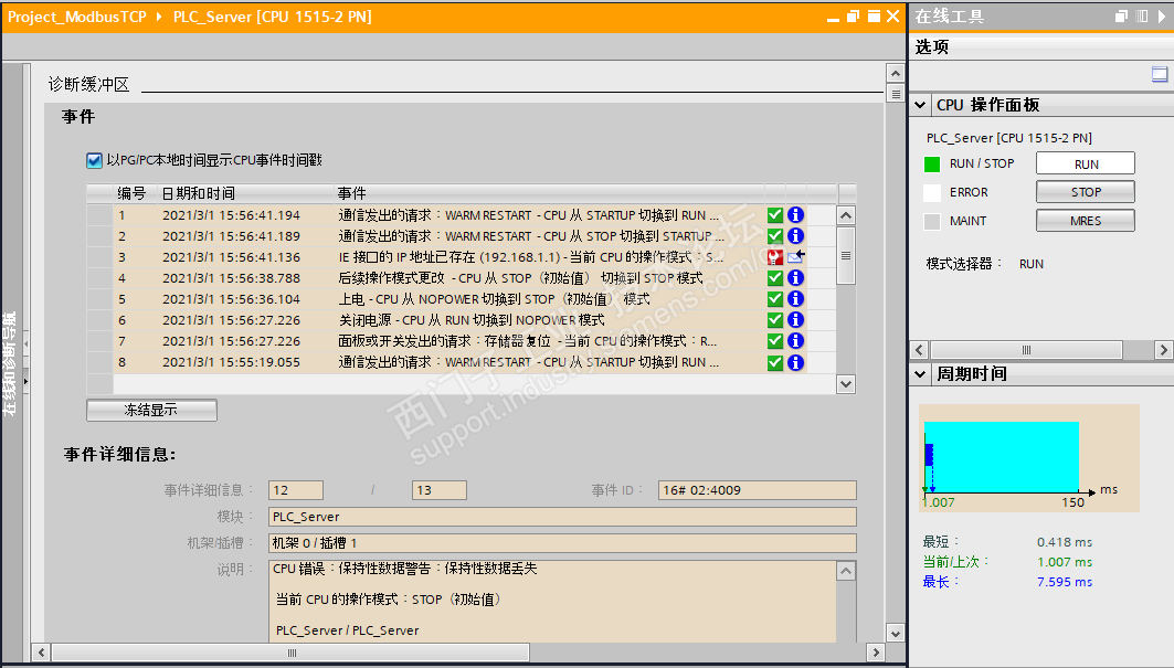 已经删除了。项目中目前有两个CPU,第一个下载没有问题,第二个下载到虚拟CPU中 Error灯红色闪烁。诊断缓存区还是提示相同的错误