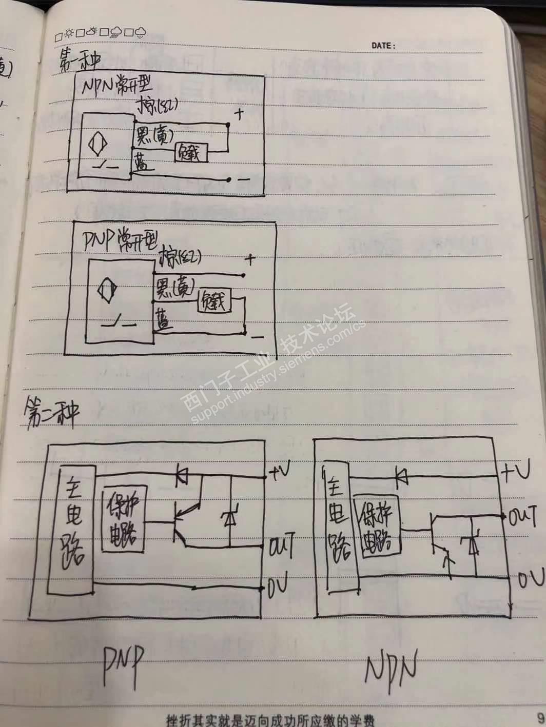 刚学完1.3小节,结合我自己的生产经验来说说PNP和NPN的区别吧。图片中所示的第一种接线是课程所展示的,第二种应该是最常见的接近开关的集电极开路输出的原理图。