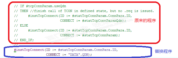 在库的静态变量中找类型为TCON的变量,找到了 “instTcpConnect”,然后搜索程序,程序中有两处 调用,代码是一样的,就是根据 #tcpConnParam.useQdn ,判断是使用域名还是使用IP地址,调用使用不同的参数调用instTcpConnect,我的程序是根据域名调用的,那我就在全局数据块中新建了一个TCON_QDN的变量,然后 instTcpConnect 之间用这个变量作为参数调用