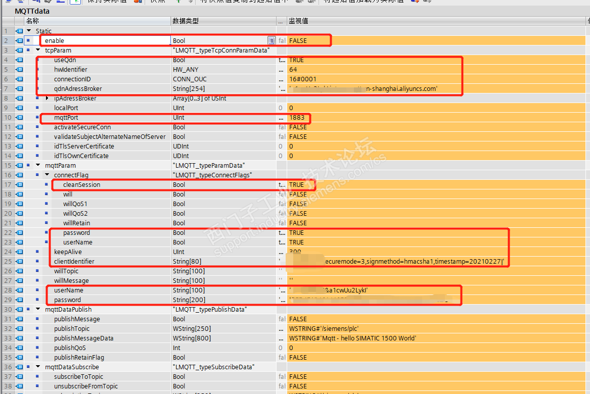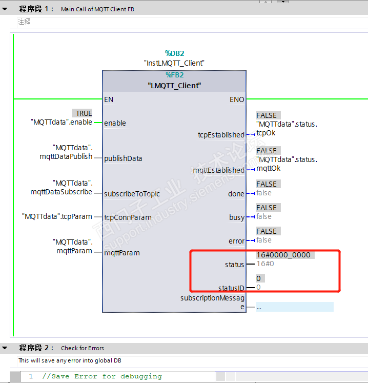 LMQTT库的使用碰到一个小坑,enable置为1,建立连接的时候,status一直报16#0000_8089错误,statusID 为2,查看库的源程序,statusID对应的是出现错误时 #statStateTcpMachine 的状态,而2对应的是TCP_CONNECTING,那就去查TCON的错误代码吧,8089对应的错误是 “参数 CONNECT 未指向连接描述,或者连接描述是手动创建的。” 或者是 “CONNECT 参数没有指向某个数据块。”