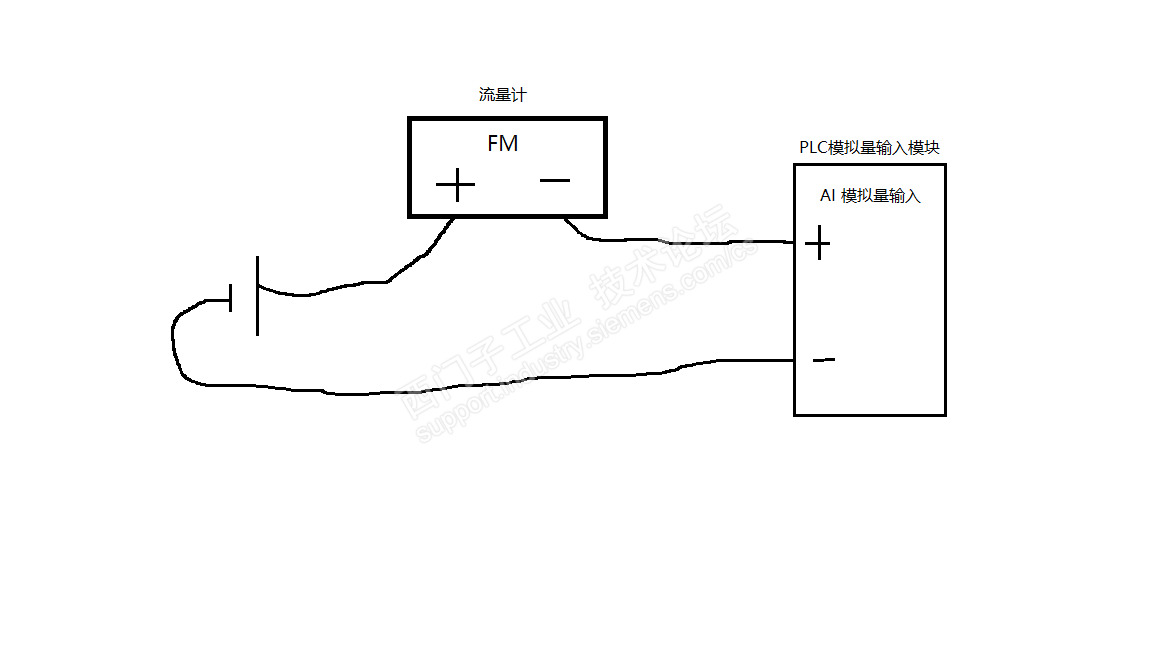 各位前辈好,在下想请教一个问题。最近甲方添加了一个流量计,输出信号是4-20mA,接到模拟量输入模块。接线的时候我的一个同事说现场仪表用的都是4线制的而且程序里面设置的也是4线制的通道模板,但是这个仪表是2线制的仪表,所以需要将这个2线制仪表接线方法修改为4线制的。接下来也是他一顿操作,我没有明白,后来请教他之后还不太明白,感觉接法就是2线制的,看不出来是4线制的。我画了一张连接示意图,麻烦各位前辈过目一下并且指点我一下,这种接法怎么是4线制的?