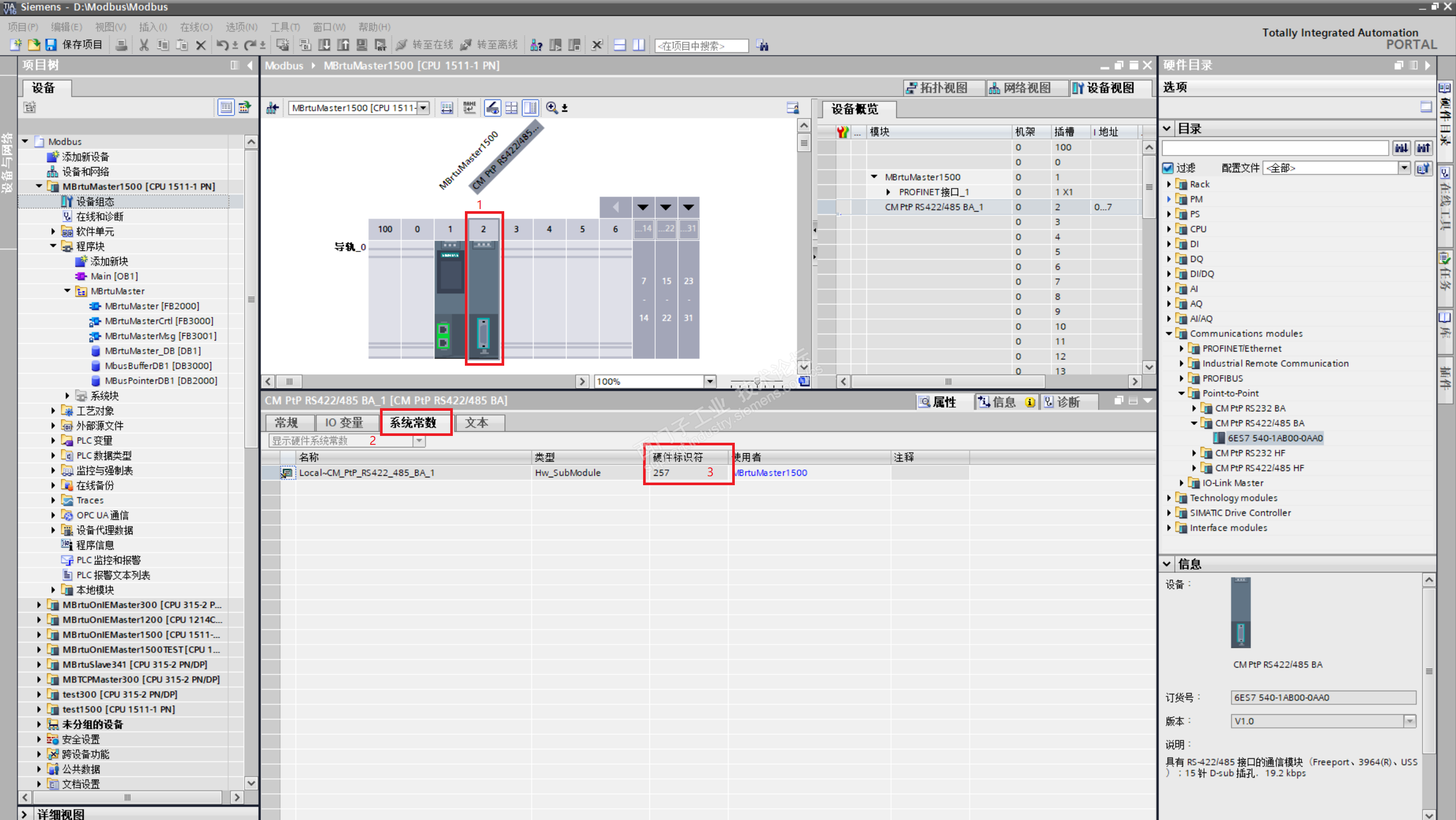 现以CM PtP RS422/485 BA为例进行硬件组态说明