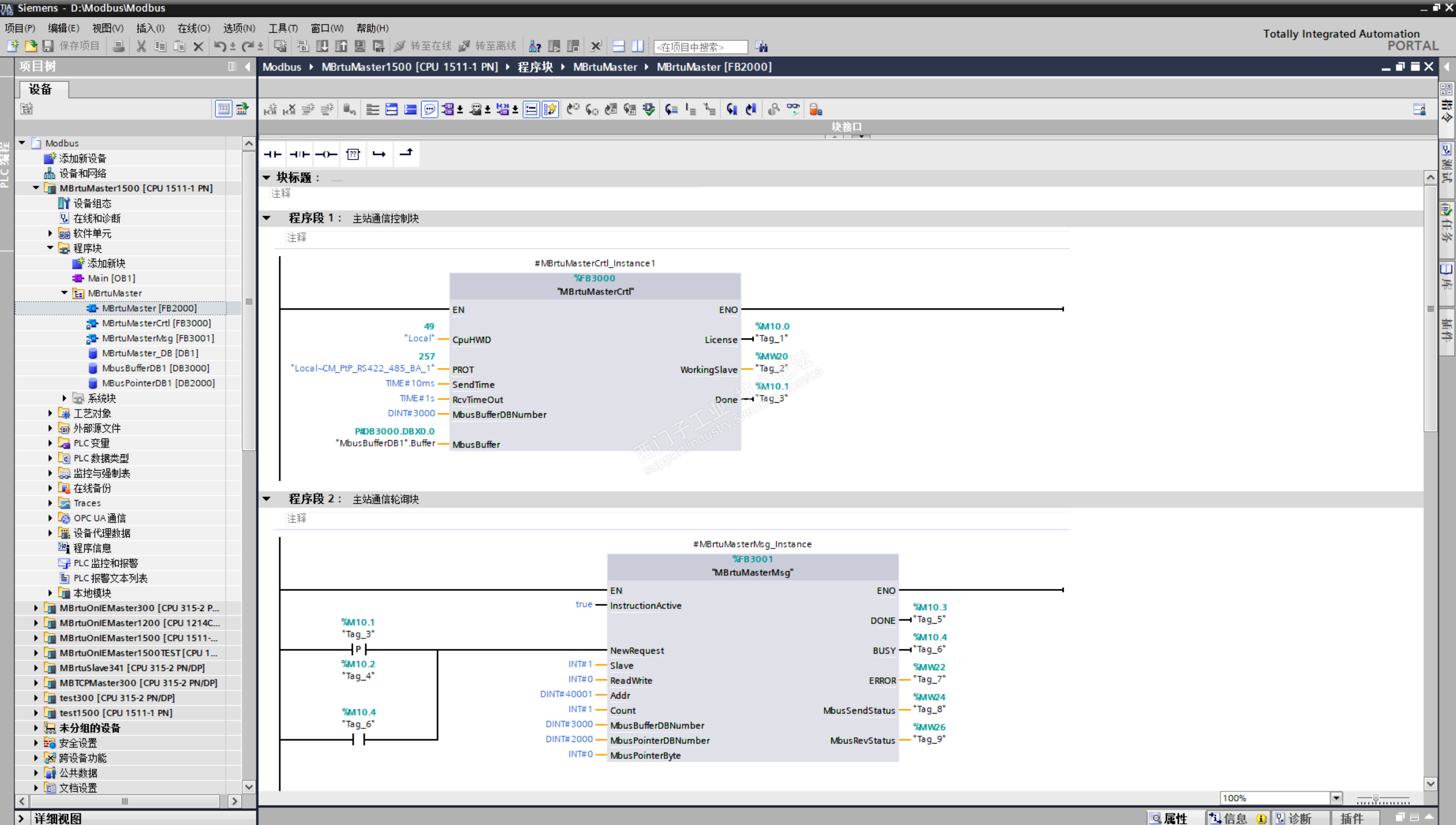 MBrtuMasterMsg:主站轮询指令功能块。可以单个块运行,也可以多个块轮流运行。根据输入参数决定把哪些用户数据放入缓冲区数据块,再将从站返回数据放回用户数据块。注意:同一时刻只允许一个主站轮询指令工作,否同返回06错误。