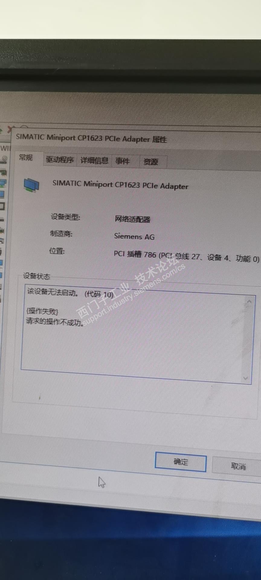 配置如上,不插cp1623卡,安装simatic net v15可以顺利完成,之后插上卡,设备管理器显示黄色感叹号,网卡无法启动,(见图1,2,3)插上卡安装simatic net v15就安装报错(见图4)不知道哪里出问题了,查了兼容列表,v15是兼容2016的,还是驱动问题吗?如果是,有推荐的版本吗?谢谢