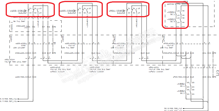 接着要查U03_S581,U05_S583,R01_S585其中U03_S581是砂轮的保护开关有振动是我们重点检查的对象,并且记录其波形,问题是U03_S581接入PLC点是常开并没有能记录到有闪断,而串在安全继电器的是常闭点如果有闪断就不好説了,看来只好先短接此信号,观察设备运行后有没有问题,结果几天下来没有故障出现,终于有了眉目。