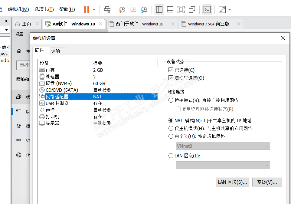 主机上也安装了博途V14,通讯都正常。 虚拟机就不行。虚拟机更改为桥接模式后,无法ping通PLC, 更改为NAT模式可以ping通PLC,但是无法搜索到PLC。重新安装了虚拟机和V14软件还是不行。在另外的一个虚拟机上安装了200smart的软件,也是无法搜到PLC,但是手动添加IP后可以下载。
