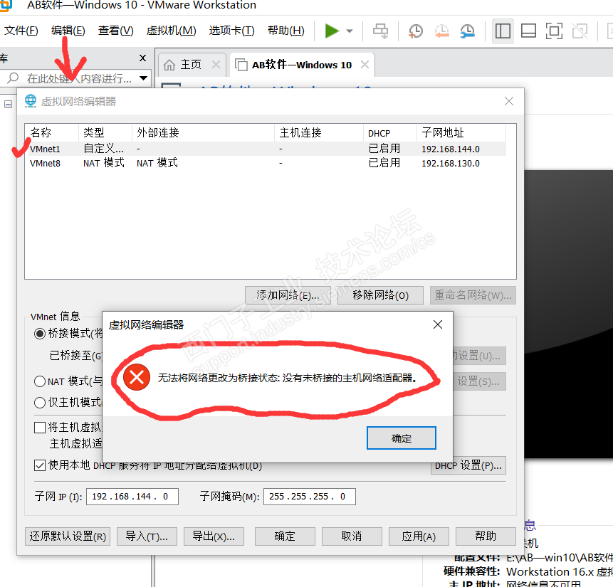 在虚拟网络编辑器中,无法选择桥接模式,会弹出错误的对话框,这样不知道是否正常?