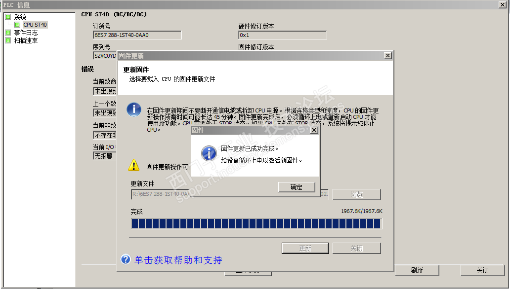 1、在线查找到CPU,在CPU信息界面,点固件更新,告知此CPU不能通过在线(以太网方式)更新固件;