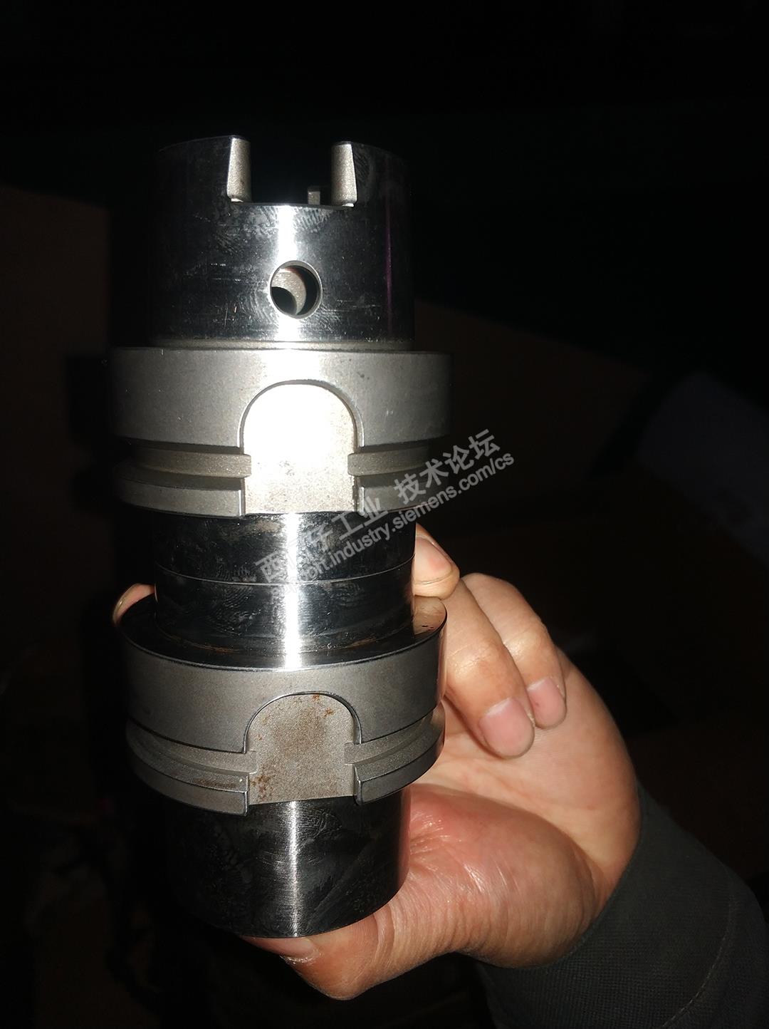 如图,用来调整自动换刀位置坐标的辅具,分上下两层,上层装在主轴上,下层装在刀夹里,里面有一个贯通的长插销,在换刀位置如果插销能顺畅地插进去就说明该位置比较准,网上找了半天不知道叫啥名。