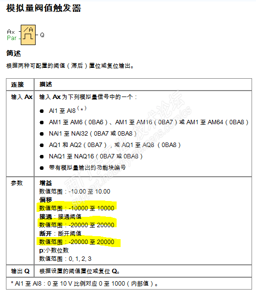 你的问题是在 模拟量阀值触发器 的数值范围最大只能是-10000~+10000,而Word明显是-32768~+32767超出这个这个模块的有效范围溢出错误了?
