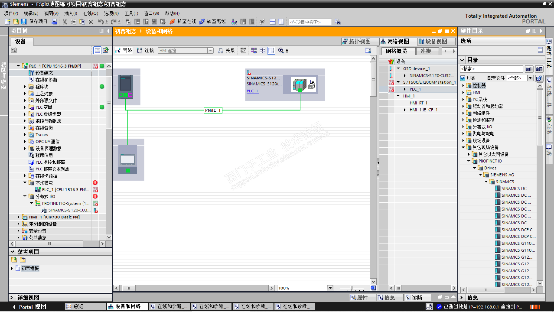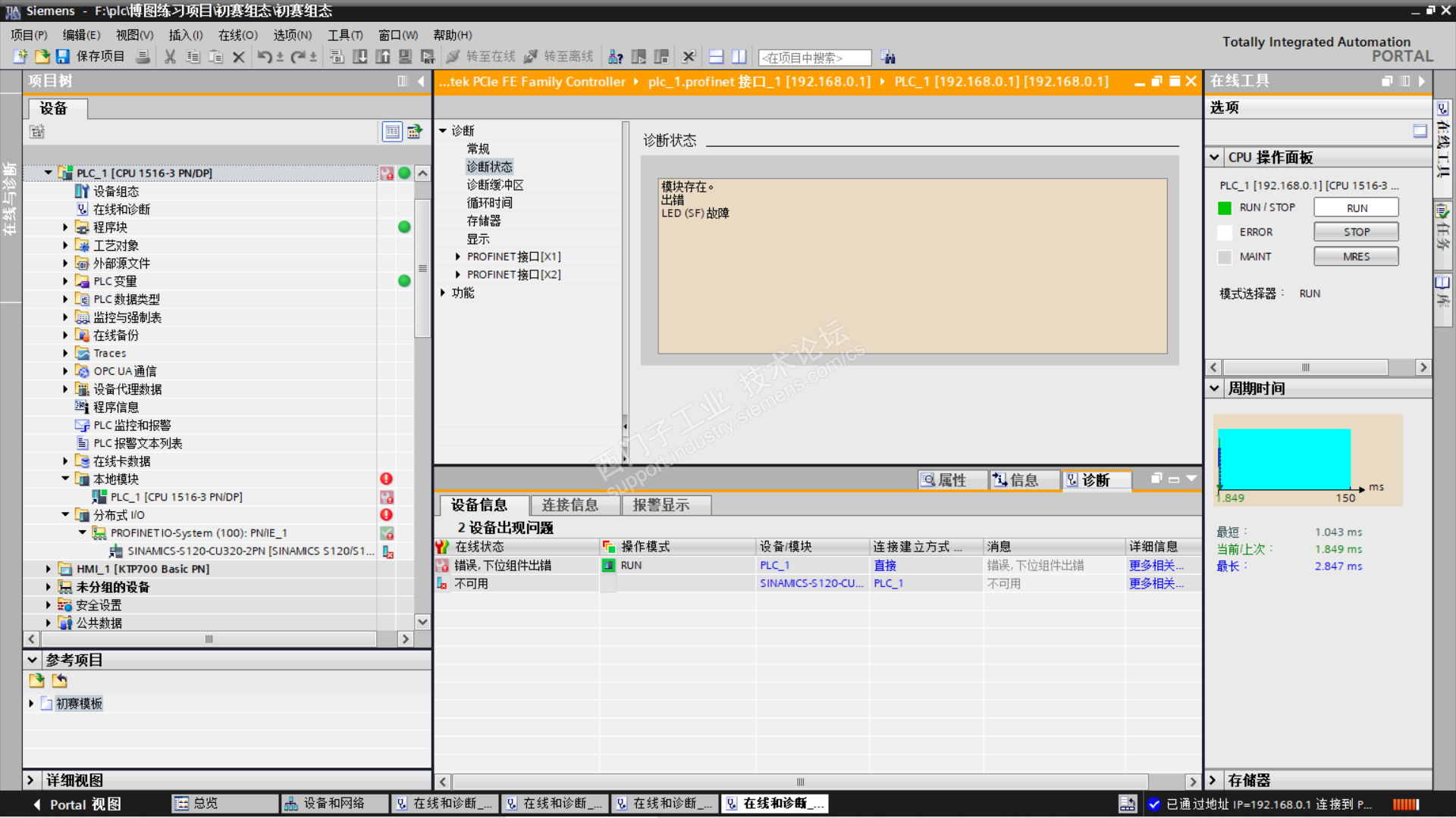 在博图里面组态1500与s120,在s120下面有do控制单元和两个do伺服,组态完下载在线的时候提示下位组件错误,我找很长时间也不知道哪里出了问题。