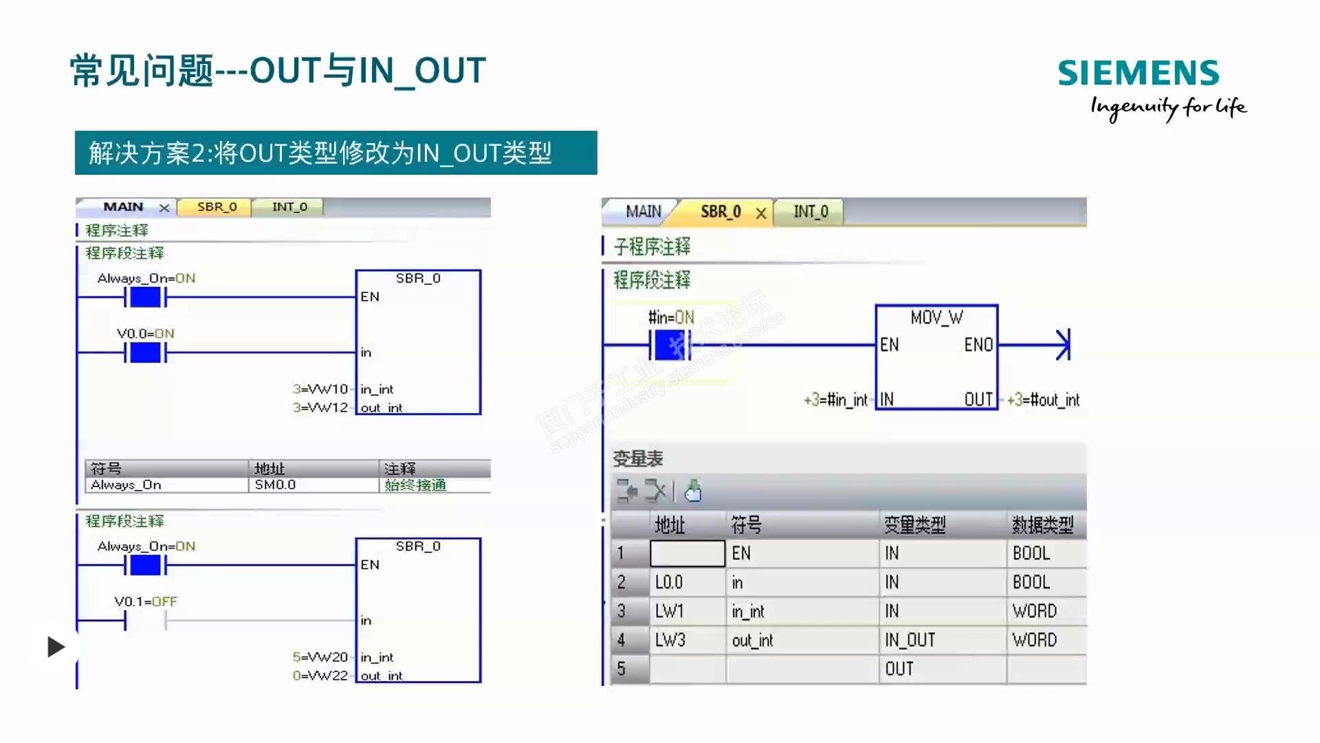 此处OUT-INT符号,为什么改为IN-OUT参数后,上面那个子程序的结果为3,下面的子程序就为0了?下面的V0.1是OFF状态,它不执行子程序里面的移动操作啊。