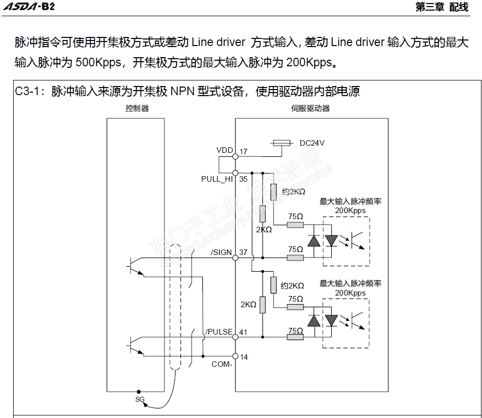 看图上的示例,检查一下接线对不对,还有伺服驱动器的参数设置的有没有问题