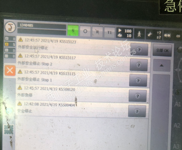 机器人需要与319Fcpu走PROFINET通讯,我在软件中设置好了64PROFISAFE IO后,在PLC上配置了PROFISAFE,下载给PLC之后,发现机器人出现5个报警,分别是安全停止、外部安全运行停止、外部安全STOP1停止、外部安全STOP2停止、外部急停。我处理了PLC程序,将安全输出的0.1、0.2、0.4、0.5、1.1都置为1,之后其他的报警都消失了,但是这个报警一直消除不了。怎么解决?图1是PLC处理安全程序后的,图2是没有处理PLC安全程序的。
